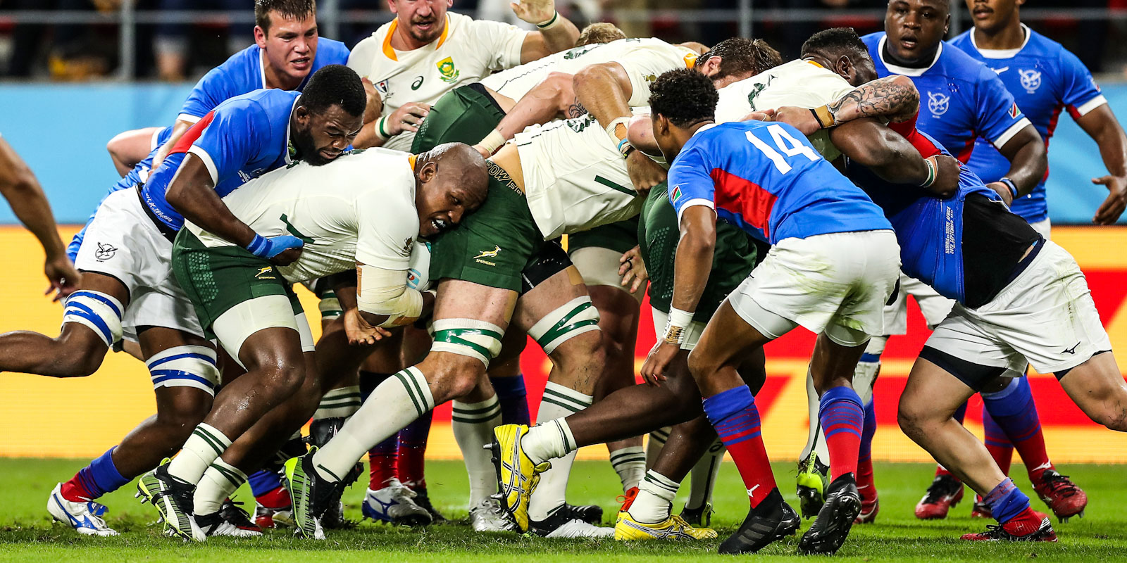 TOYOTA, JAPAN - SEPTEMBER 28: Mbongeni Mbonambi of South Africa drives through the pack on his way to scoring a try during the Rugby World Cup 2019 Group B game between South Africa and Namibia at City of Toyota Stadium on September 28, 2019 in Toyota, Aichi, Japan. (Photo by Shaun Botterill/Getty Images)